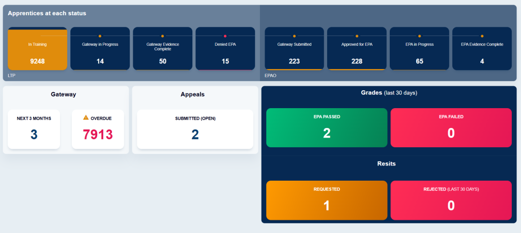 The dashboard gives an instant overview of the current status of your apprentice records, based on your user permissions and/or apprentice assignments.