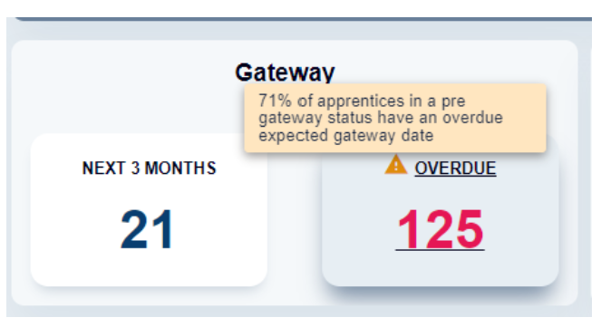 ACE360’s Dashboard also shows any gateways that are overdue, as well as a percentage of how many of your apprentices have gone past their expected gateway date. This has been designed to show your EPAOs and you as a provider the volume of apprentices that are past their end date. To change this information you can edit the apprentice’s expected gateway date.