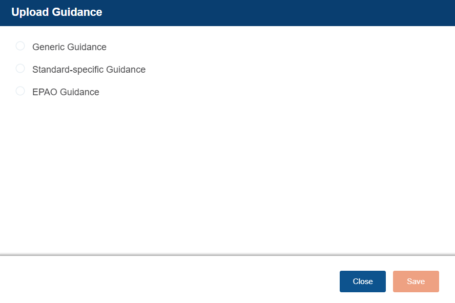 - Select either the Generic Guidance, Standard-Specific Guidance, or EPAO Guidance option to upload a document into the correct section